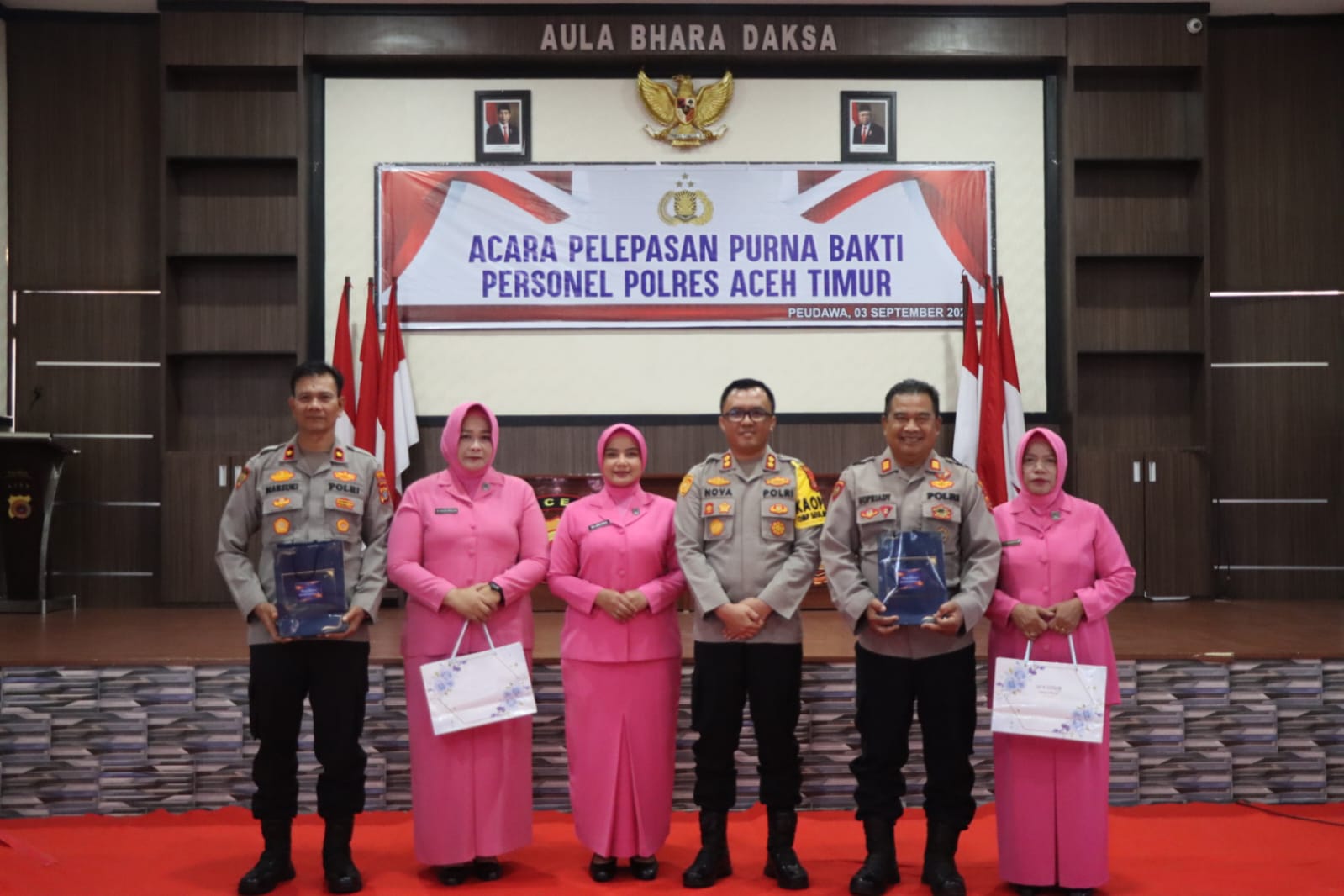 Polres Aceh Timur, Polda Aceh menggelar kegiatan pelepasan Purnabhakti bagi anggota Polri yang telah memasuki masa pensiun bertempat di Aula Bhara Daksa Polres Aceh Timur, Selasa, (03/09/2024) pagi.