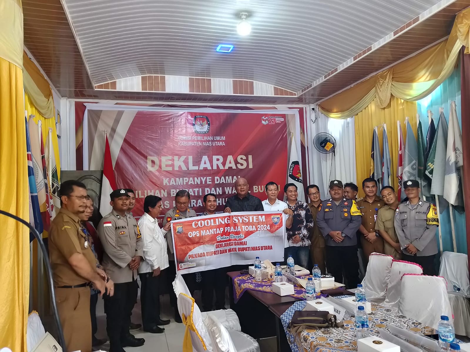 Acara dihadiri oleh berbagai pihak, termasuk perwakilan Kapolres Nias, Dandim Nias, camat, Kemenag, kejaksaan, dan pimpinan partai pengusung