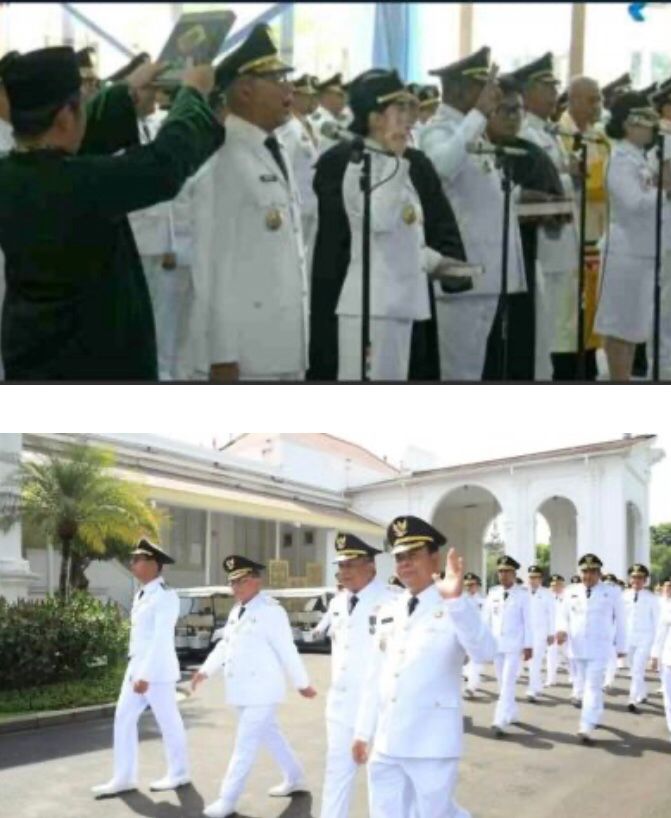 Kemudian Pengucapan sumpah/janji jabatan dipandu langsung oleh Presiden RI selaku pejabat yang melantik. Sekaligus penanda tanganan berita acara pengucapan sumpah/janji jabatan dan Pemasangan tanda pangkat jabatan, penyematan tanda jabatan dan penyerahan Keputusan Presiden untuk pelantikan Gubernur dan Wakil Gubernur atau pemasangan tanda pangkat jabatan, penyematan tanda jabatan dan penyerahan Keputusan Menteri untuk pelantikan Bupati dan Wakil Bupati atau Wali kota dan Wakil Wali kota.